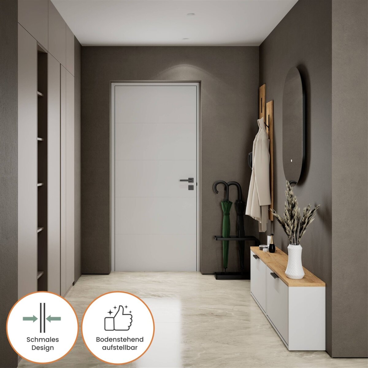 Dieser moderne Schuhschrank ist die perfekte Lösung für alle, die auch in engen Fluren oder kompakten Dielen nicht auf Stil und Ordnung verzichten möchten. Mit einer Tiefe von nur 23 cm bietet er überraschend viel Stauraum bei minimalem Platzbedarf. Hinter der grifflosen Klappe verbirgt sich ein durchdacht strukturierter Innenraum mit einem flexibel nutzbaren Regalboden – ideal zur Aufbewahrung verschiedenster Schuhtypen.