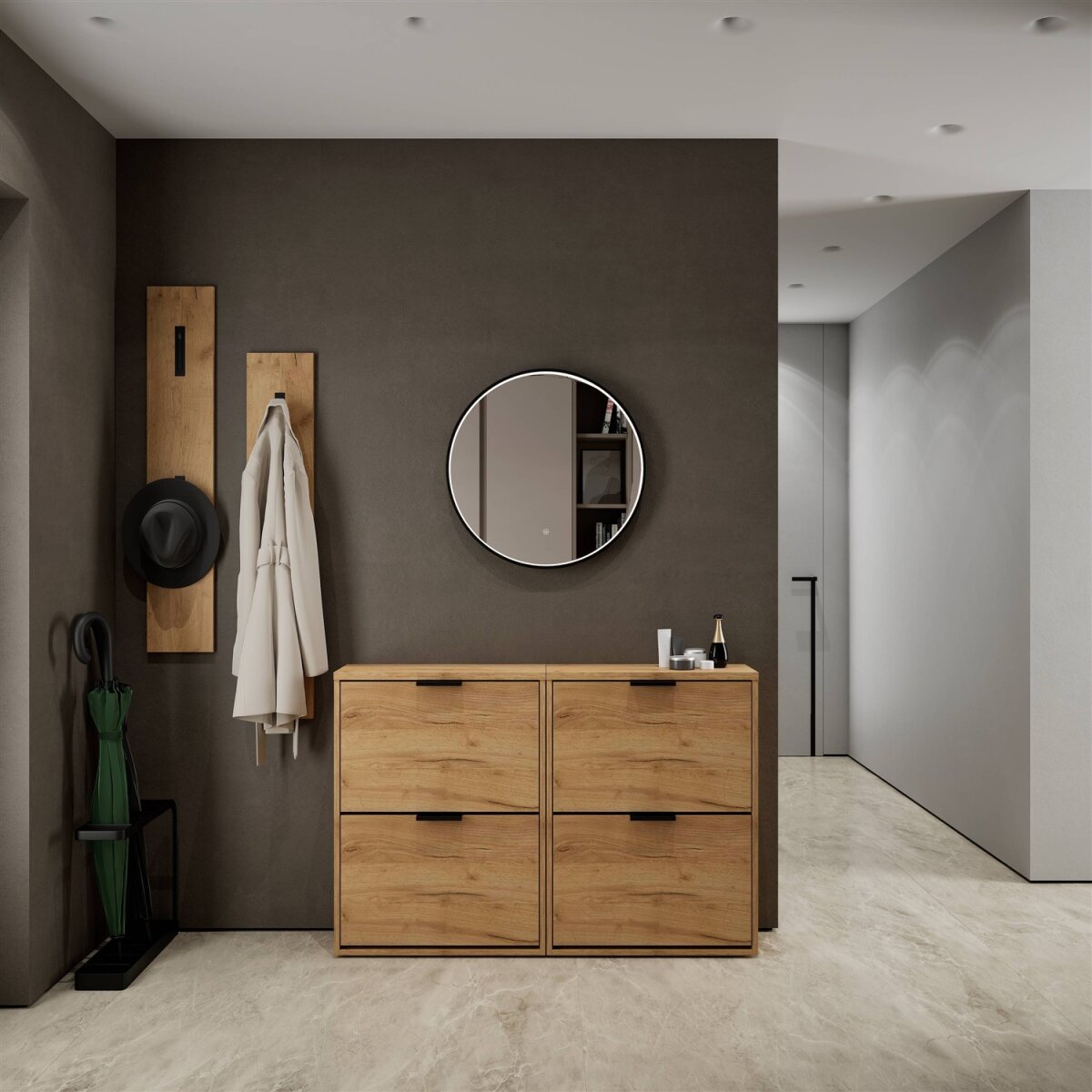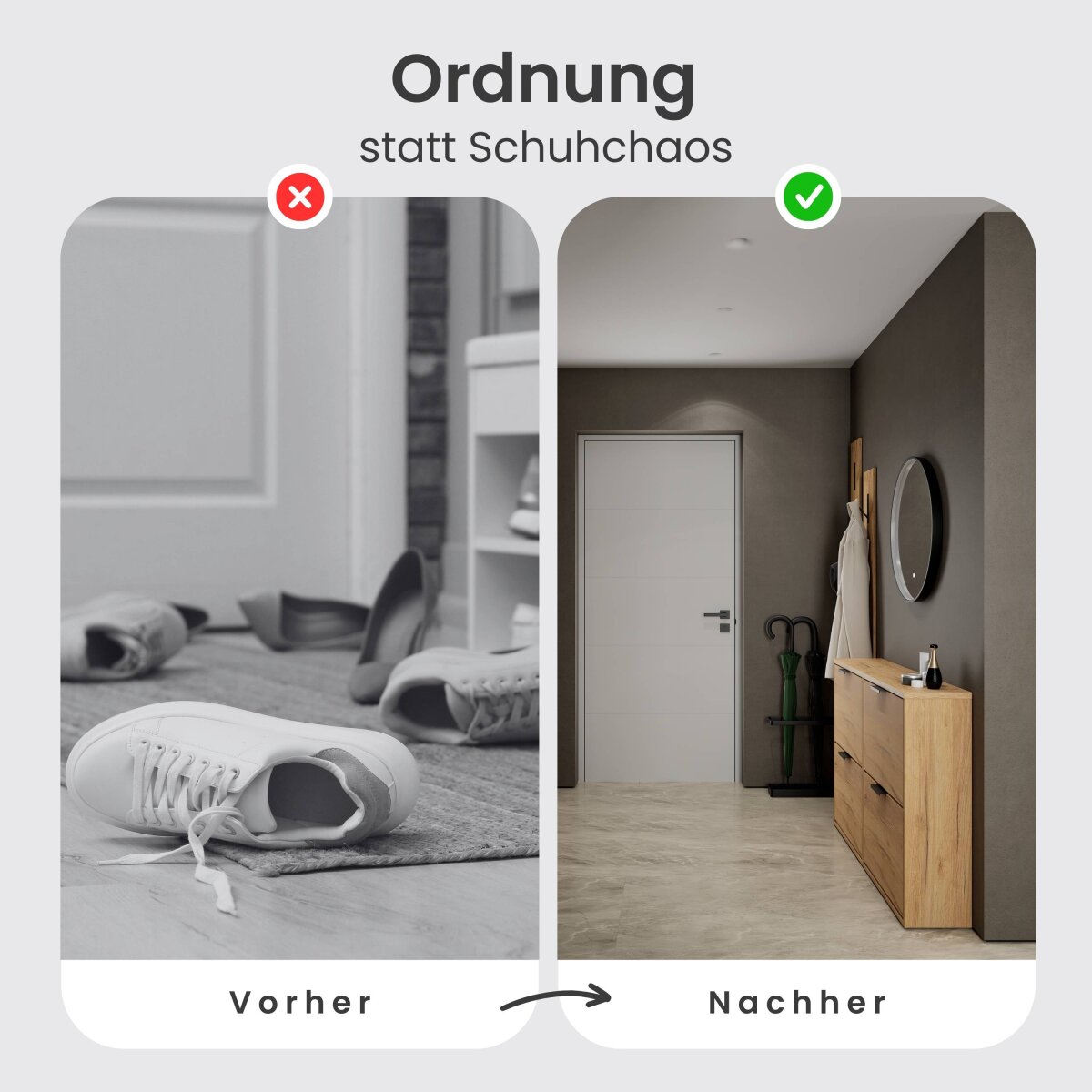 Der integrierte Regalboden lässt sich zweifach in der Höhe verstellen oder bei Bedarf vollständig entnehmen. Dadurch kann der Innenraum optimal an unterschiedliche Schuhtypen angepasst werden – von flachen Sneakers bis hin zu Stiefeletten oder Absatzschuhen. So bleibt der Eingangsbereich stets ordentlich und strukturiert.
