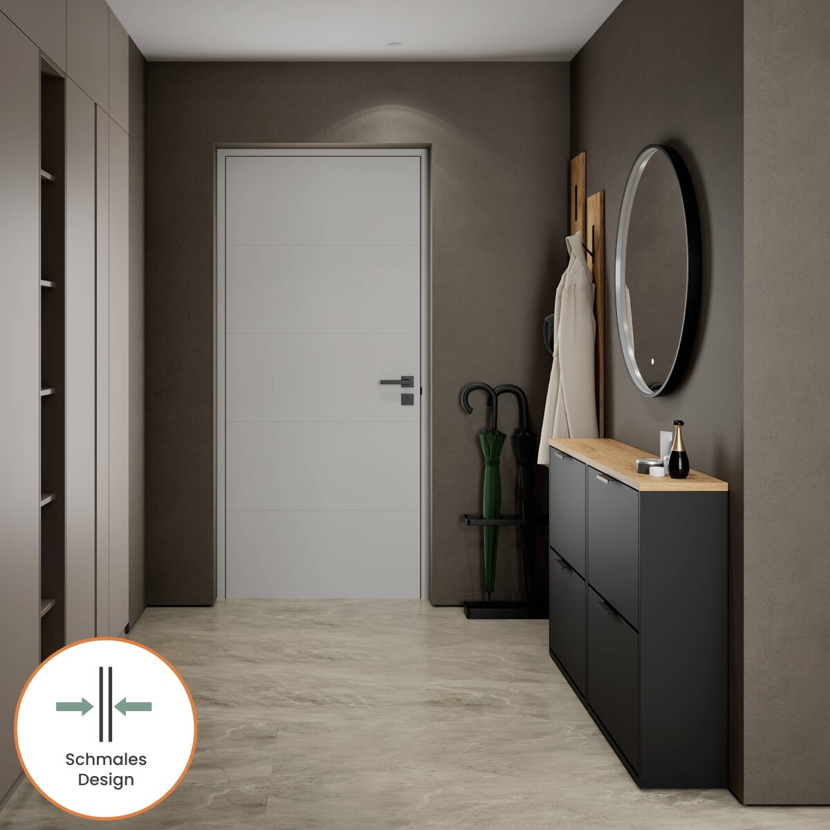 Dieser moderne Schuhschrank ist die perfekte Lösung für alle, die auch in engen Fluren oder kompakten Dielen nicht auf Stil und Ordnung verzichten möchten. Mit einer Tiefe von nur 23 cm bietet er überraschend viel Stauraum bei minimalem Platzbedarf. Hinter der grifflosen Klappe verbirgt sich ein durchdacht strukturierter Innenraum mit einem flexibel nutzbaren Regalboden – ideal zur Aufbewahrung verschiedenster Schuhtypen.