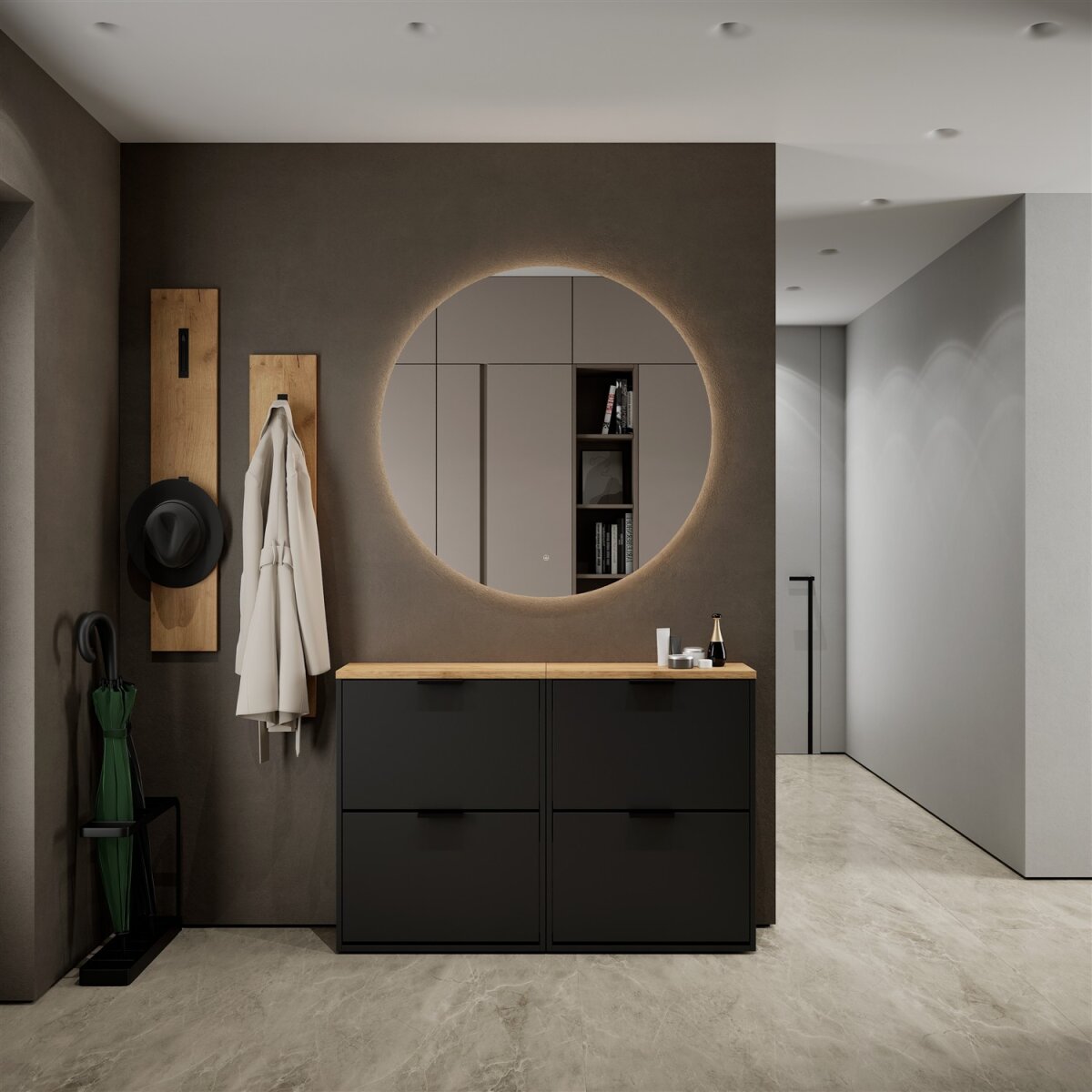 Der NOVA Spiegel (⌀ 100 cm) integriert sich ideal in Ihrem Flur und sorgt dank der integrierten Beleuchtung mit neutral weißem Licht (4200K) für eine und angenehme Ausleuchtung)