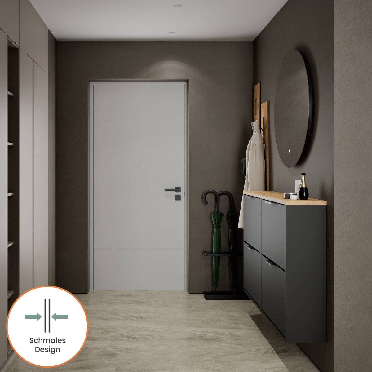 Dieser moderne Schuhschrank ist die perfekte Lösung für alle, die auch in engen Fluren oder kompakten Dielen nicht auf Stil und Ordnung verzichten möchten. Mit einer Tiefe von nur 23 cm bietet er überraschend viel Stauraum bei minimalem Platzbedarf. Hinter der grifflosen Klappe verbirgt sich ein durchdacht strukturierter Innenraum mit einem flexibel nutzbaren Regalboden – ideal zur Aufbewahrung verschiedenster Schuhtypen.