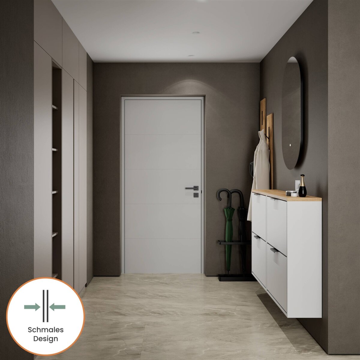 Dieser moderne Schuhschrank ist die perfekte Lösung für alle, die auch in engen Fluren oder kompakten Dielen nicht auf Stil und Ordnung verzichten möchten. Mit einer Tiefe von nur 23 cm bietet er überraschend viel Stauraum bei minimalem Platzbedarf. Hinter der grifflosen Klappe verbirgt sich ein durchdacht strukturierter Innenraum mit einem flexibel nutzbaren Regalboden – ideal zur Aufbewahrung verschiedenster Schuhtypen.