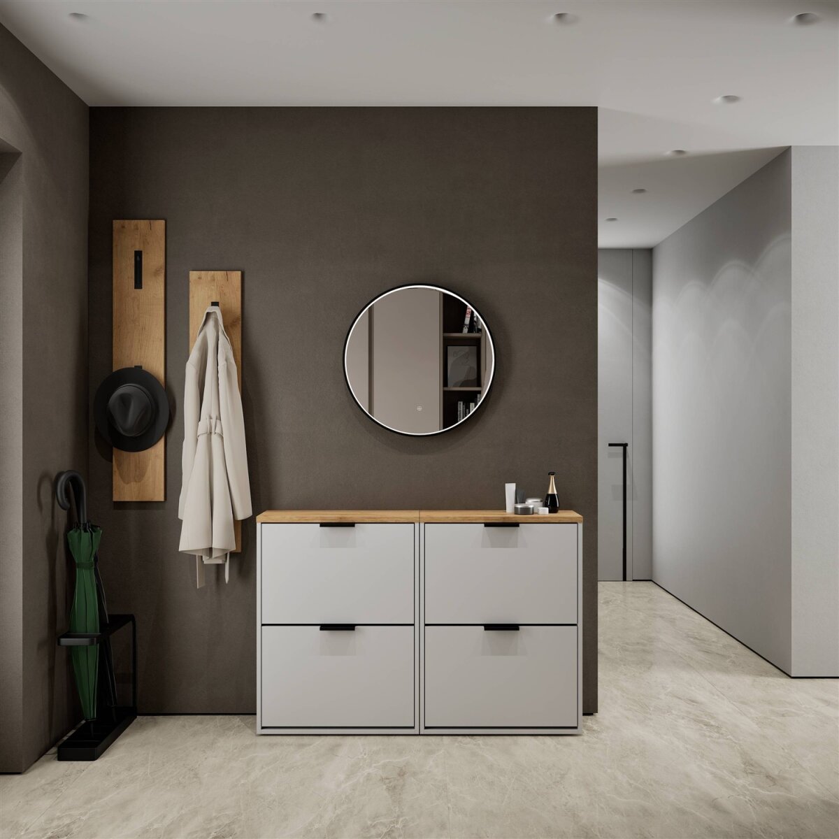 Der integrierte Regalboden lässt sich zweifach in der Höhe verstellen oder bei Bedarf vollständig entnehmen. Dadurch kann der Innenraum optimal an unterschiedliche Schuhtypen angepasst werden – von flachen Sneakers bis hin zu Stiefeletten oder Absatzschuhen. So bleibt der Eingangsbereich stets ordentlich und strukturiert.
