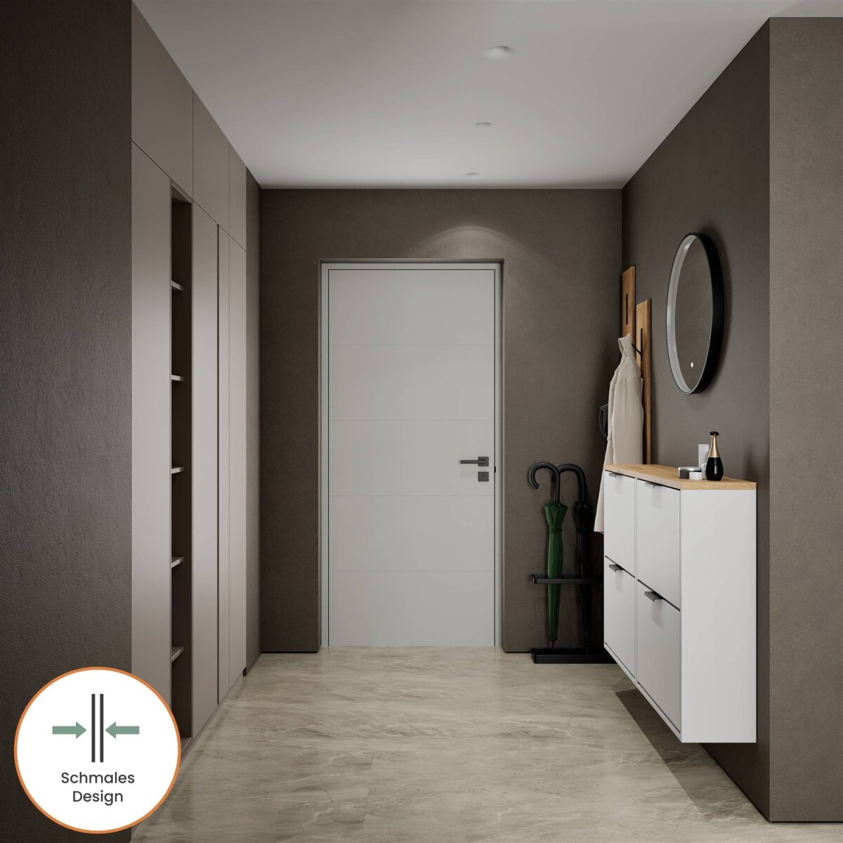 Dieser moderne Schuhschrank ist die perfekte Lösung für alle, die auch in engen Fluren oder kompakten Dielen nicht auf Stil und Ordnung verzichten möchten. Mit einer Tiefe von nur 23 cm bietet er überraschend viel Stauraum bei minimalem Platzbedarf. Hinter der grifflosen Klappe verbirgt sich ein durchdacht strukturierter Innenraum mit einem flexibel nutzbaren Regalboden – ideal zur Aufbewahrung verschiedenster Schuhtypen.