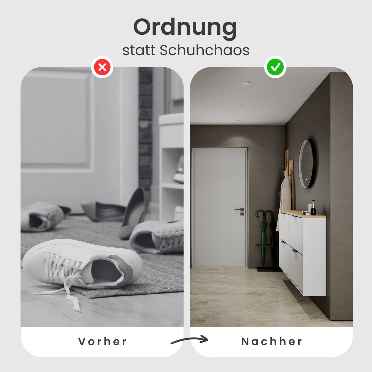 | Lieferungsumfang: | 2x Schuhschrank, 1x LED-Spiegel, 1x Montagematerial, 1x Montageanleitung |
