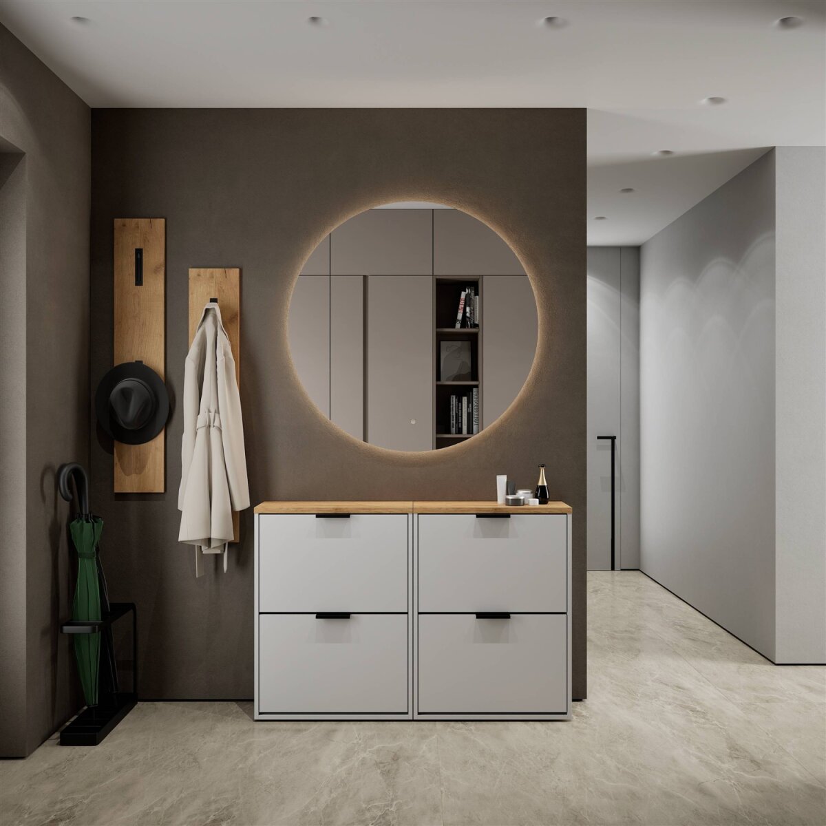 Der NOVA Spiegel (⌀ 100 cm) integriert sich ideal in Ihrem Flur und sorgt dank der integrierten Beleuchtung mit neutral weißem Licht (4200K) für eine und angenehme Ausleuchtung)