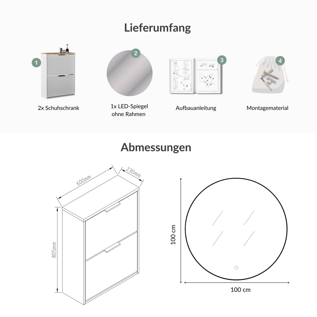 | Lieferungsumfang: | 2x Schuhschrank, 1x LED-Spiegel, 1x Montagematerial, 1x Montageanleitung |