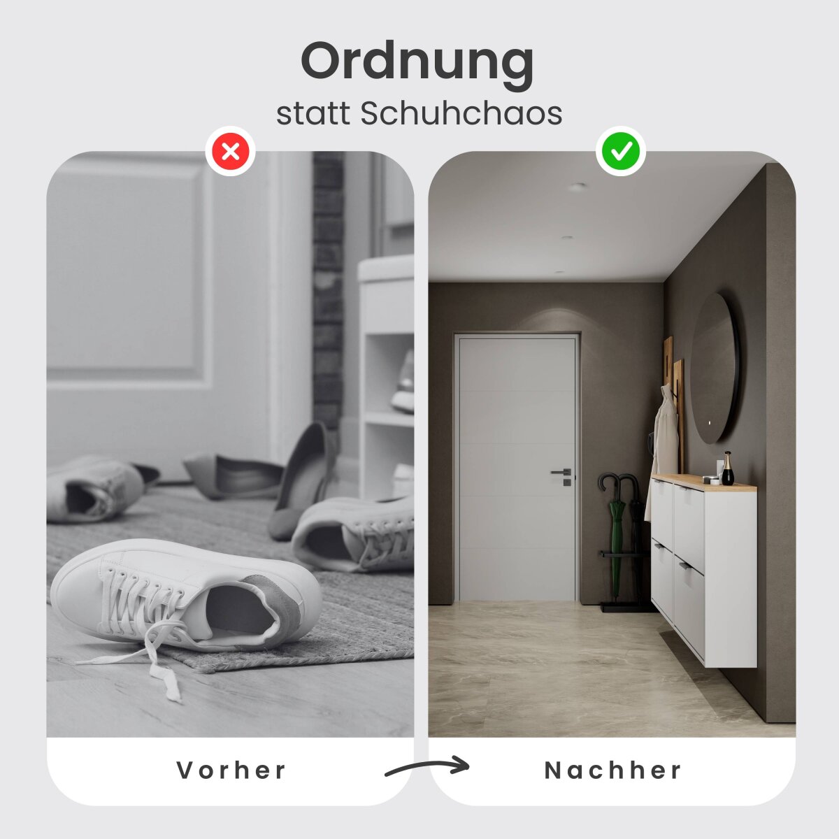 Der integrierte Regalboden lässt sich zweifach in der Höhe verstellen oder bei Bedarf vollständig entnehmen. Dadurch kann der Innenraum optimal an unterschiedliche Schuhtypen angepasst werden – von flachen Sneakers bis hin zu Stiefeletten oder Absatzschuhen. So bleibt der Eingangsbereich stets ordentlich und strukturiert.