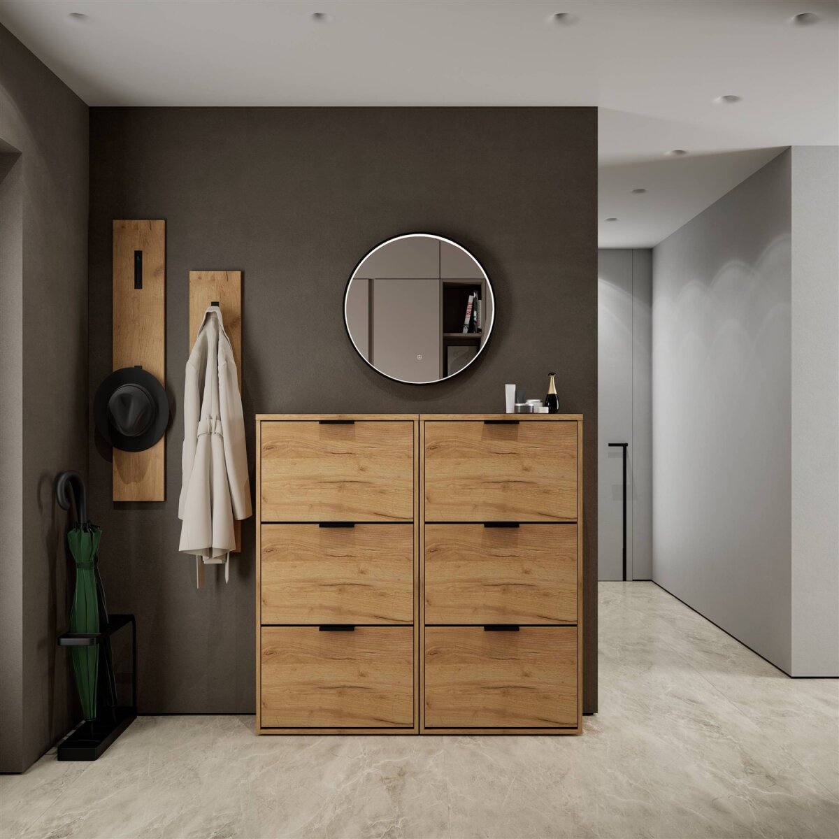 Die strapazierfähige Melaminbeschichtung schützt vor Feuchtigkeit, Kratzern und Schmutz. Perfekt geeignet für den Alltag mit nassen Schuhen im Eingangsbereich. Der Korpus aus hochwertigem Holzwerkstoff sorgt für Stabilität und eine lange Lebensdauer. Die Klappmechanik mit modernen Griffen ermöglicht eine einfache und bequeme Nutzung – auch bei wenig Platz.