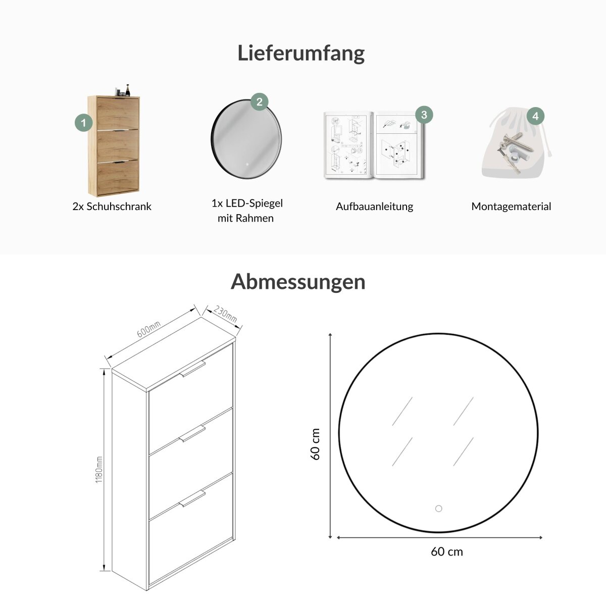 | Lieferungsumfang: | 2x Schuhschrank, 1x LED-Spiegel, 1x Montagematerial, 1x Montageanleitung |