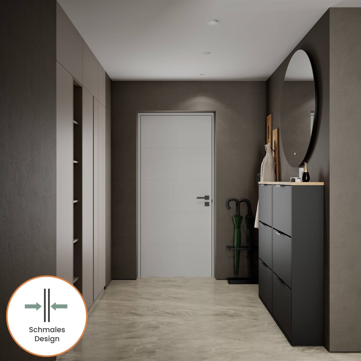 Dieser moderne Schuhschrank ist die perfekte Lösung für alle, die auch in engen Fluren oder kompakten Dielen nicht auf Stil und Ordnung verzichten möchten. Mit einer Tiefe von nur 23 cm bietet er überraschend viel Stauraum bei minimalem Platzbedarf. Hinter der grifflosen Klappe verbirgt sich ein durchdacht strukturierter Innenraum mit einem flexibel nutzbaren Regalboden – ideal zur Aufbewahrung verschiedenster Schuhtypen.