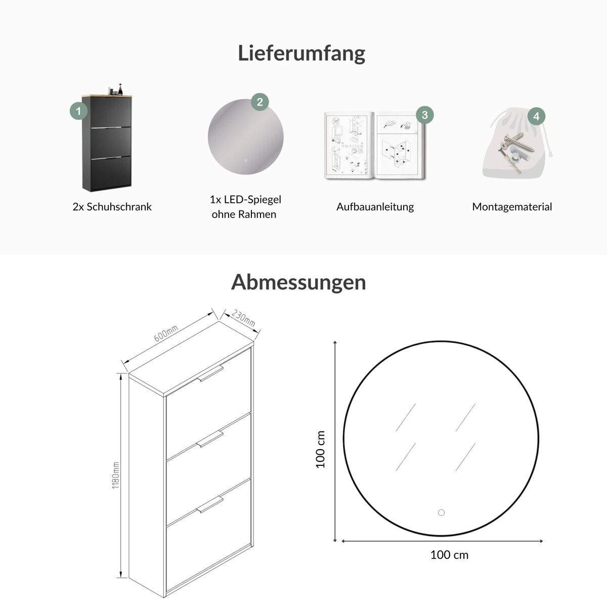 | Lieferungsumfang: | 2x Schuhschrank, 1x LED-Spiegel, 1x Montagematerial, 1x Montageanleitung |