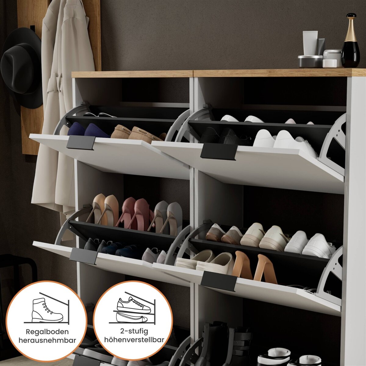 Der integrierte Regalboden lässt sich zweifach in der Höhe verstellen oder bei Bedarf vollständig entnehmen. Dadurch kann der Innenraum optimal an unterschiedliche Schuhtypen angepasst werden – von flachen Sneakers bis hin zu Stiefeletten oder Absatzschuhen. So bleibt der Eingangsbereich stets ordentlich und strukturiert.