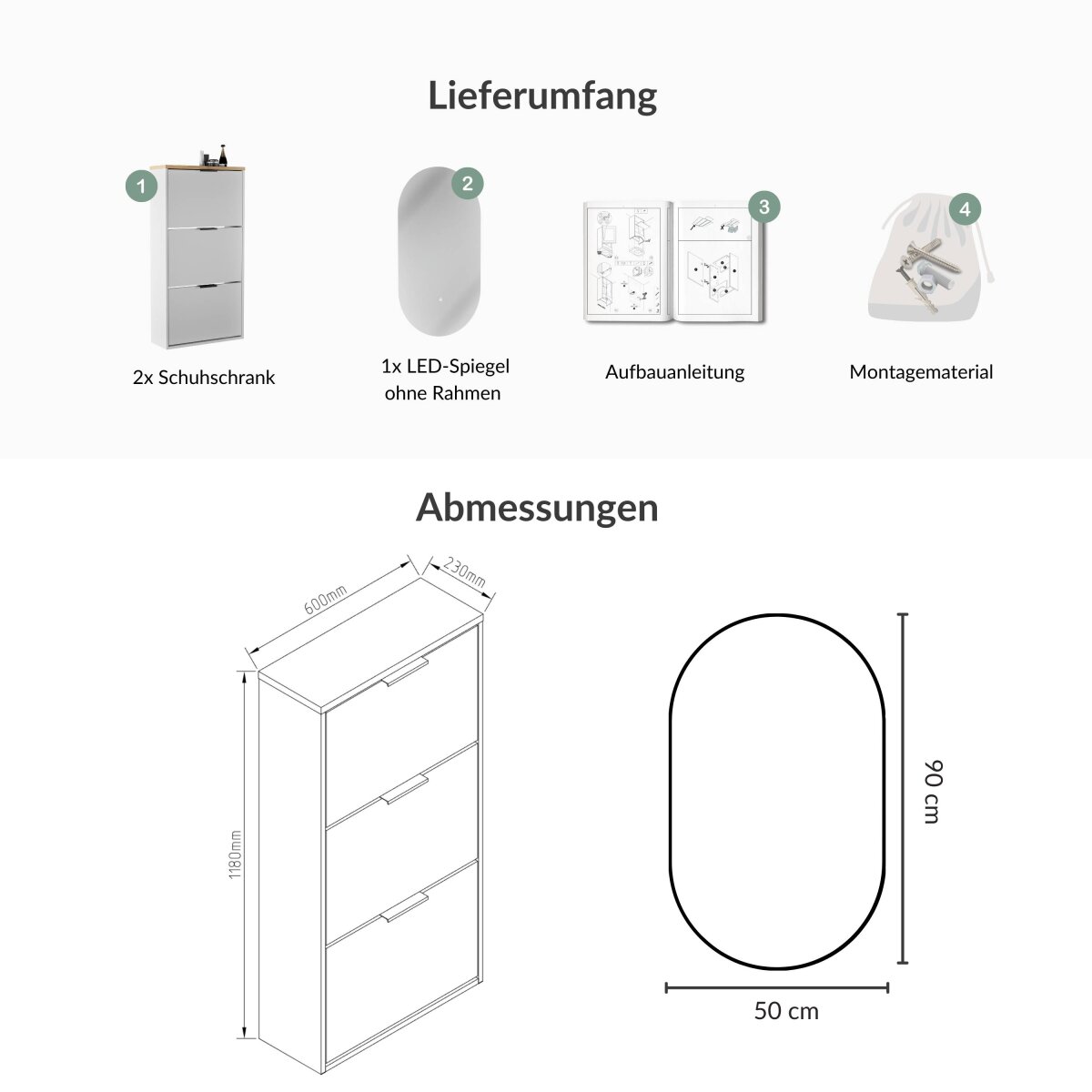 | Lieferungsumfang: | 1x Schuhschrank, 1x LED-Spiegel, 1x Montagematerial, 1x Montageanleitung |