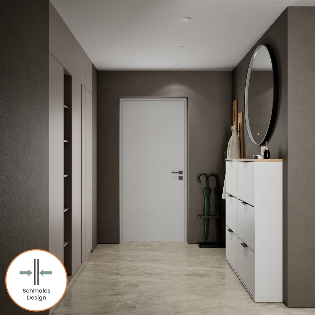 Dieser moderne Schuhschrank ist die perfekte Lösung für alle, die auch in engen Fluren oder kompakten Dielen nicht auf Stil und Ordnung verzichten möchten. Mit einer Tiefe von nur 23 cm bietet er überraschend viel Stauraum bei minimalem Platzbedarf. Hinter der grifflosen Klappe verbirgt sich ein durchdacht strukturierter Innenraum mit einem flexibel nutzbaren Regalboden – ideal zur Aufbewahrung verschiedenster Schuhtypen.