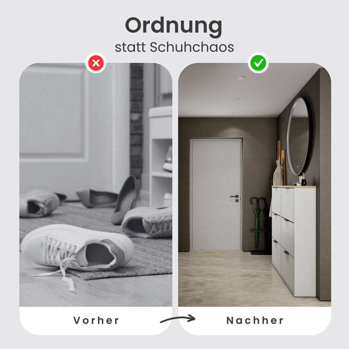 | Lieferungsumfang: | 2x Schuhschrank, 1x LED-Spiegel, 1x Montagematerial, 1x Montageanleitung |