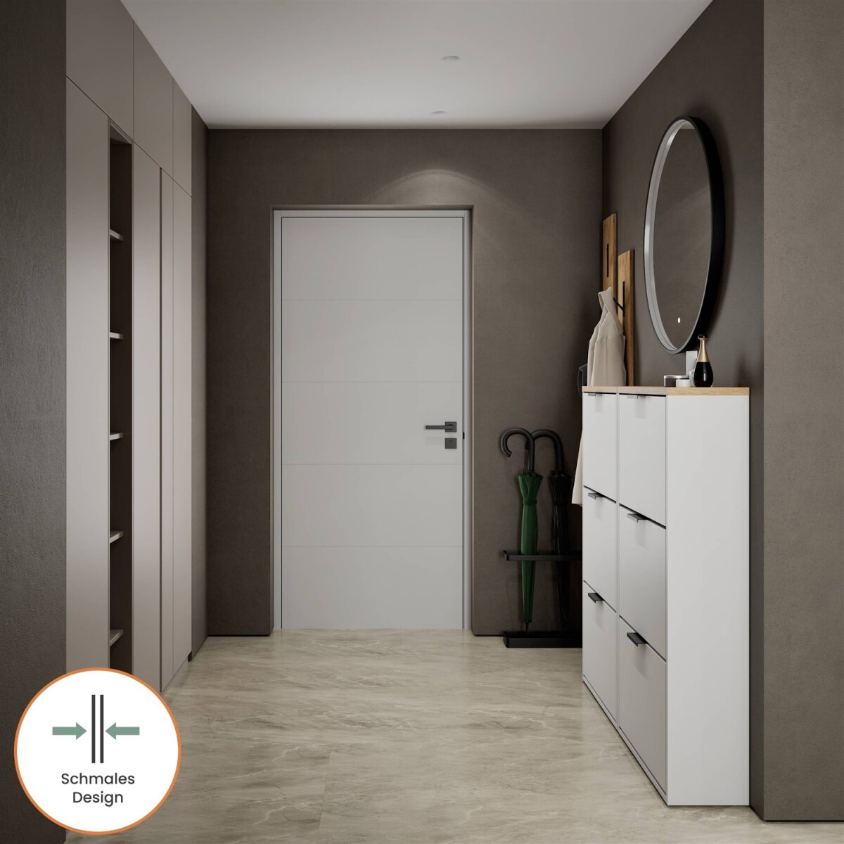 Dieser moderne Schuhschrank ist die perfekte Lösung für alle, die auch in engen Fluren oder kompakten Dielen nicht auf Stil und Ordnung verzichten möchten. Mit einer Tiefe von nur 23 cm bietet er überraschend viel Stauraum bei minimalem Platzbedarf. Hinter der grifflosen Klappe verbirgt sich ein durchdacht strukturierter Innenraum mit einem flexibel nutzbaren Regalboden – ideal zur Aufbewahrung verschiedenster Schuhtypen.
