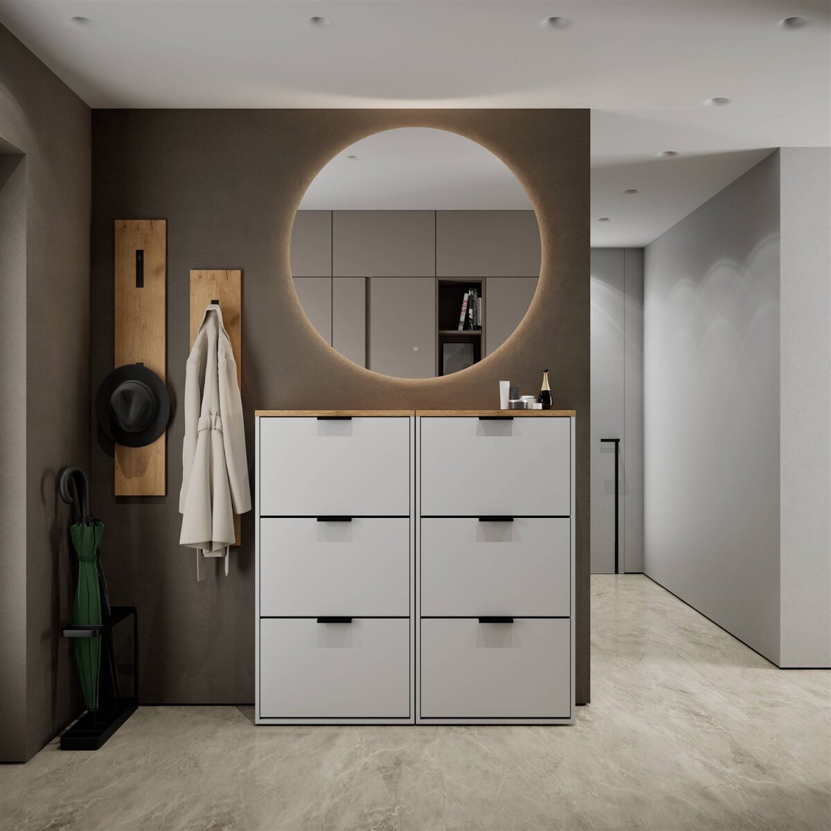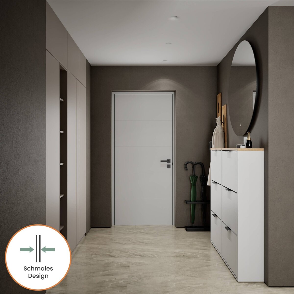Dieser moderne Schuhschrank ist die perfekte Lösung für alle, die auch in engen Fluren oder kompakten Dielen nicht auf Stil und Ordnung verzichten möchten. Mit einer Tiefe von nur 23 cm bietet er überraschend viel Stauraum bei minimalem Platzbedarf. Hinter der grifflosen Klappe verbirgt sich ein durchdacht strukturierter Innenraum mit einem flexibel nutzbaren Regalboden – ideal zur Aufbewahrung verschiedenster Schuhtypen.