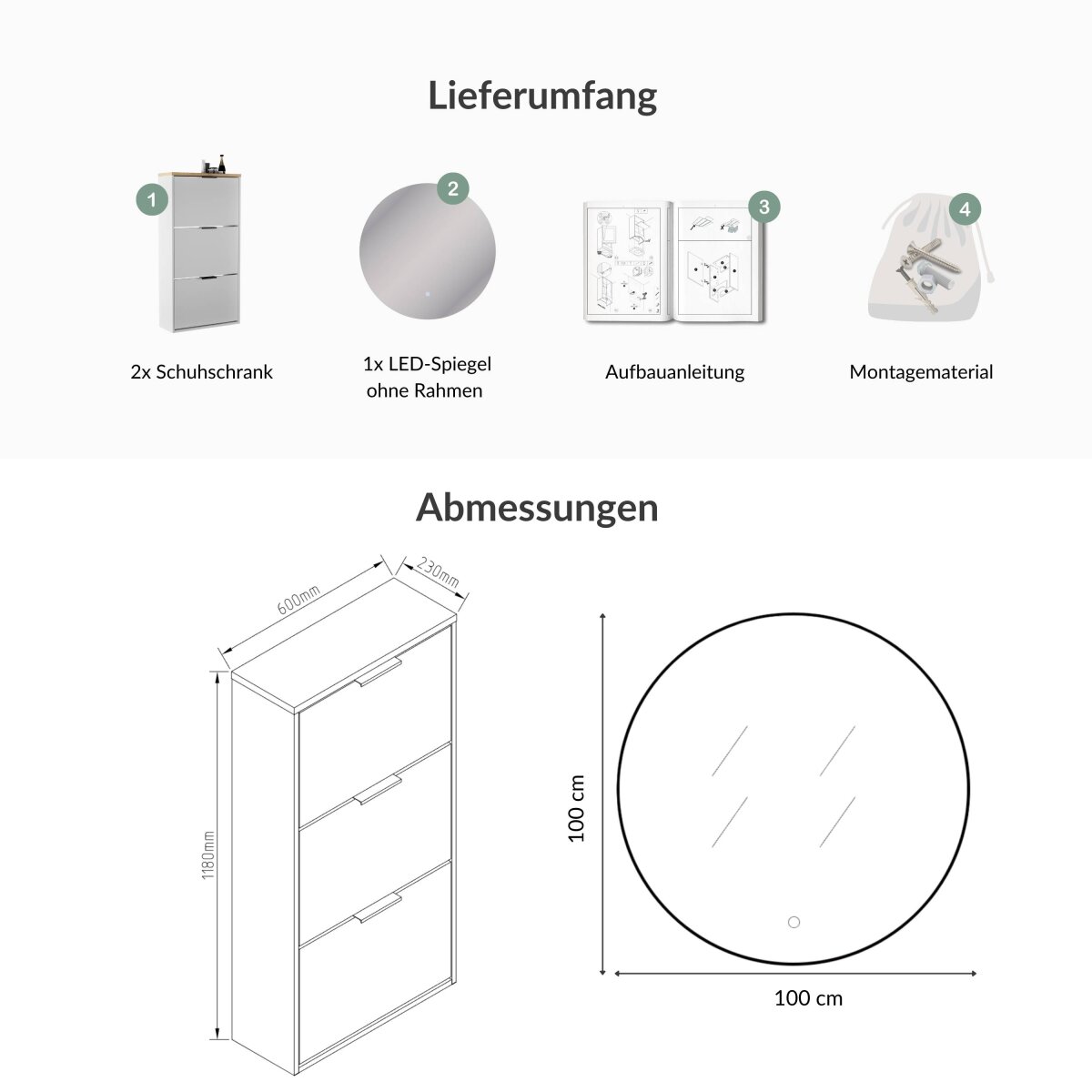 | Lieferungsumfang: | 2x Schuhschrank, 1x LED-Spiegel, 1x Montagematerial, 1x Montageanleitung |