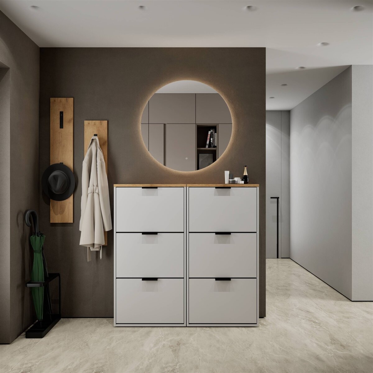 Dieser moderne Schuhschrank ist die perfekte Lösung für alle, die auch in engen Fluren oder kompakten Dielen nicht auf Stil und Ordnung verzichten möchten. Mit einer Tiefe von nur 23 cm bietet er überraschend viel Stauraum bei minimalem Platzbedarf. Hinter der grifflosen Klappe verbirgt sich ein durchdacht strukturierter Innenraum mit einem flexibel nutzbaren Regalboden – ideal zur Aufbewahrung verschiedenster Schuhtypen.