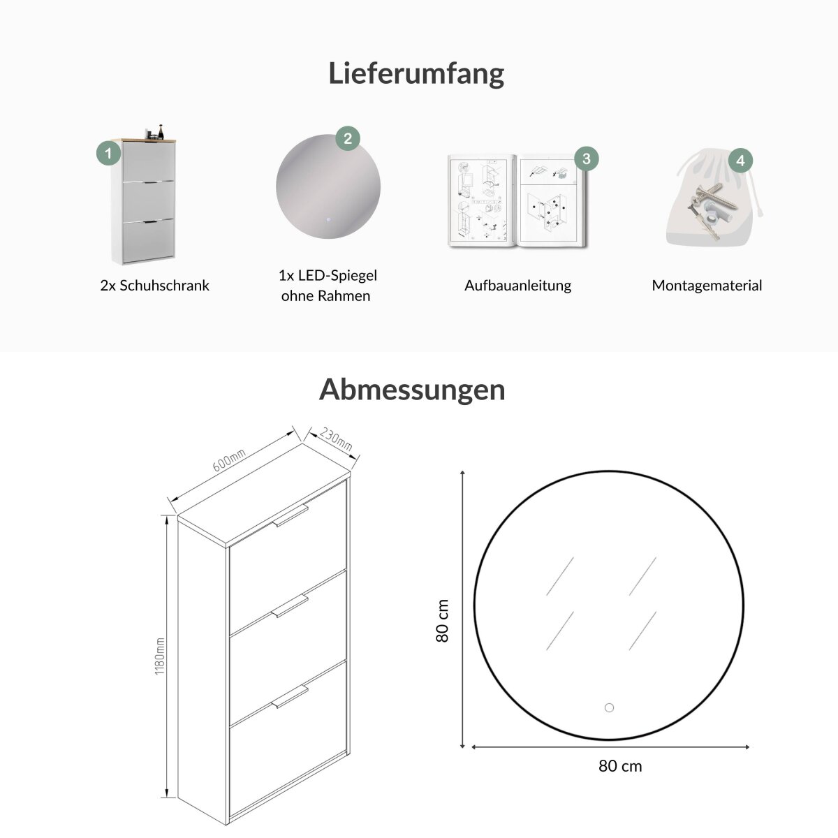 | Lieferungsumfang: | 2x Schuhschrank, 1x LED-Spiegel, 1x Montagematerial, 1x Montageanleitung |