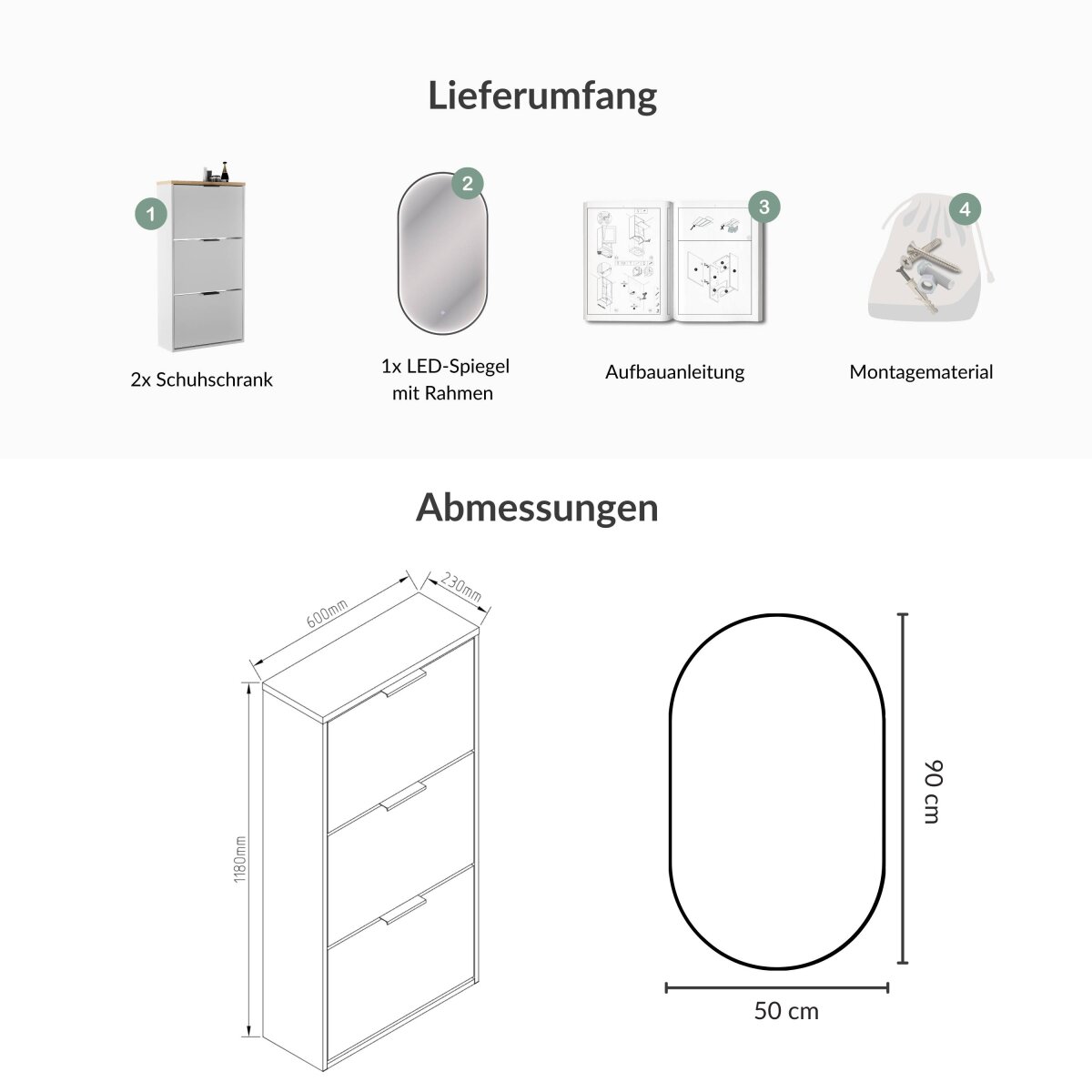| Lieferungsumfang: | 1x Schuhschrank, 1x LED-Spiegel, 1x Montagematerial, 1x Montageanleitung |
