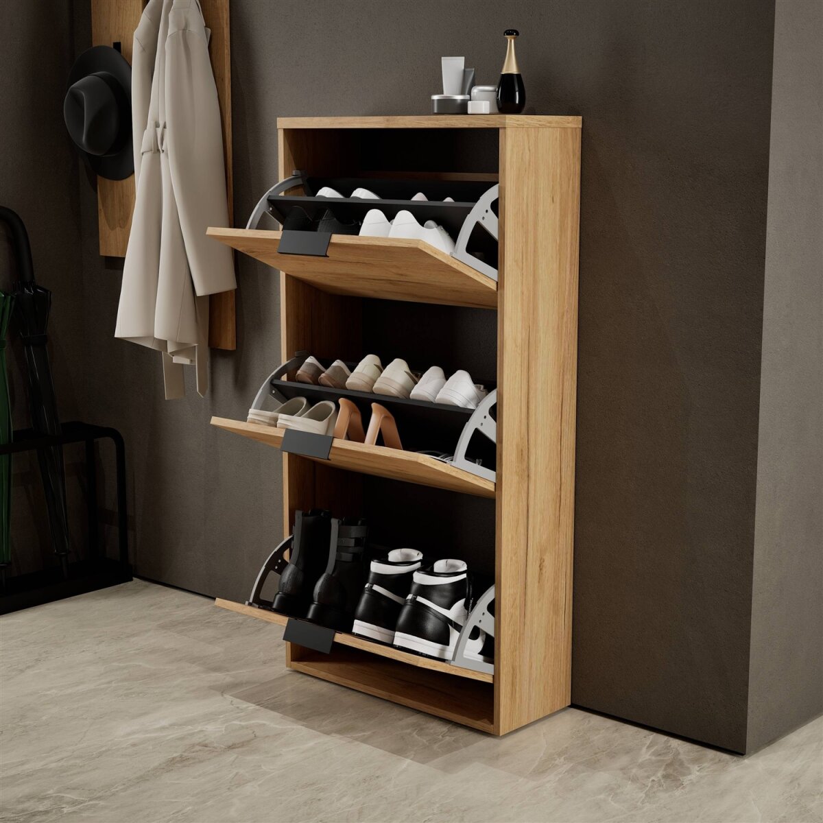 Hinter der eleganten, grifflosen Klappe zeigt sich ein durchdacht strukturierter Innenbereich mit flexibel einstellbarem Regalboden – ideal, um verschiedene Schuhtypen ordentlich zu organisieren.