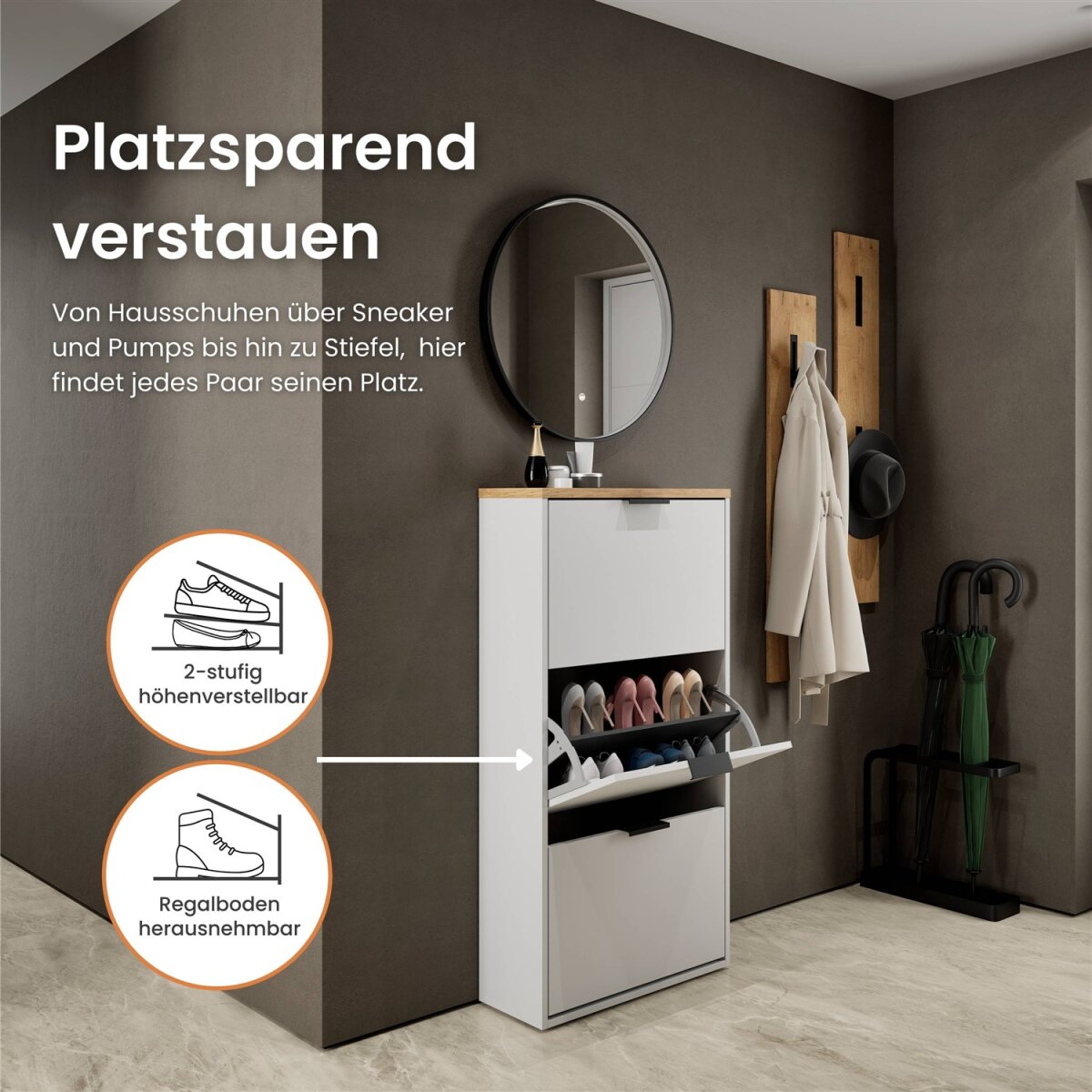 Der integrierte Regalboden lässt sich zweifach in der Höhe verstellen oder bei Bedarf vollständig entnehmen. Dadurch kann der Innenraum optimal an unterschiedliche Schuhtypen angepasst werden – von flachen Sneakers bis hin zu Stiefeletten oder Absatzschuhen. So bleibt der Eingangsbereich stets ordentlich und strukturiert.