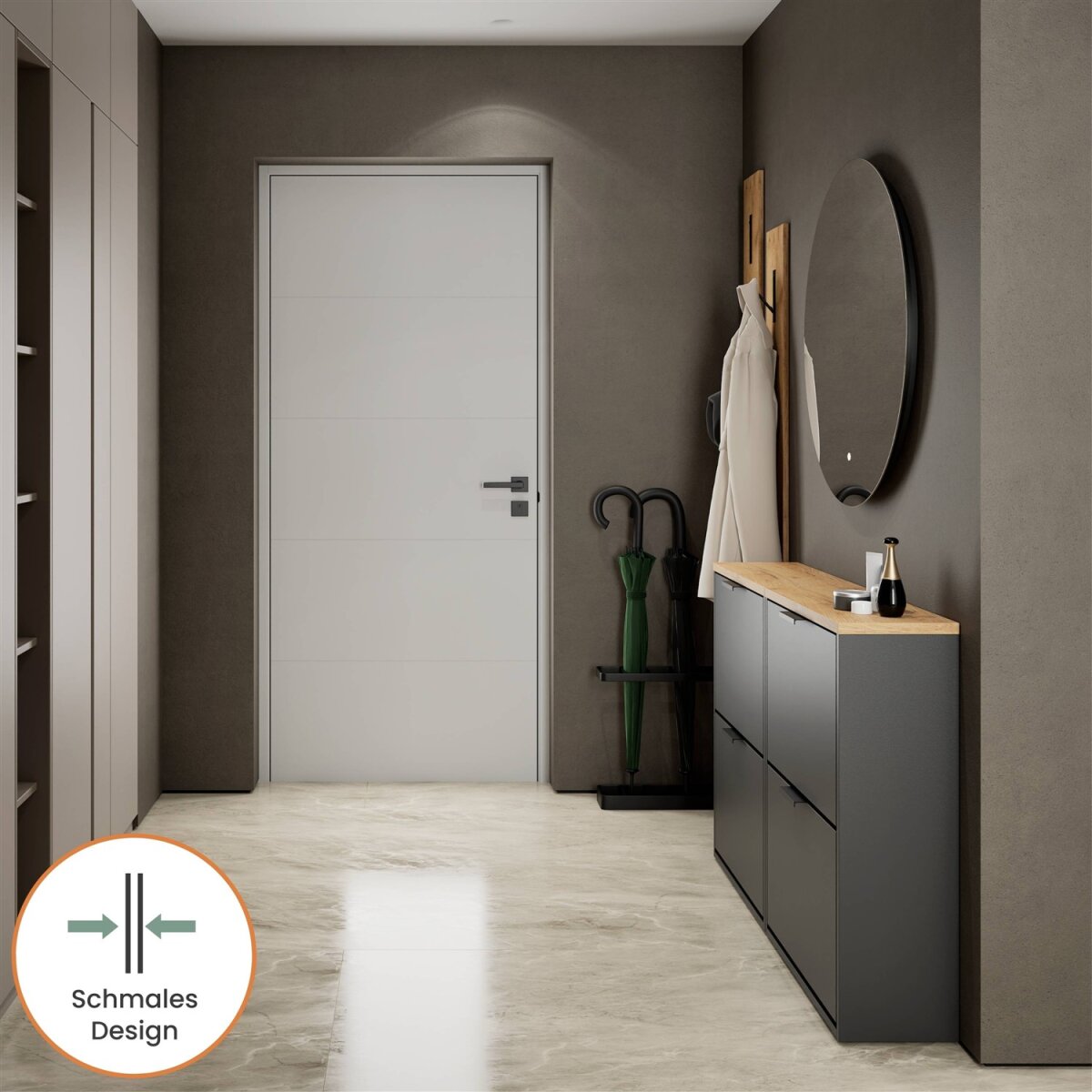 With its clean, timeless design, the shoe cabinet fits effortlessly into a wide range of interior styles – whether modern, Scandinavian or classic. Available in several colors such as white, black or golden oak, the cabinet can be flexibly combined and adapted to individual living concepts. It also comes in different sizes with one, two or three flaps, offering the right solution for every room situation.