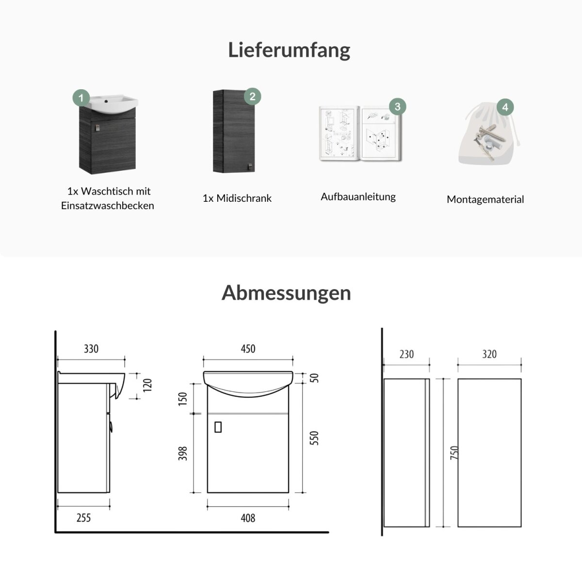 Badmöbel-Set – Waschtisch mit Keramikwaschbecken 45 cm & Midischrank
