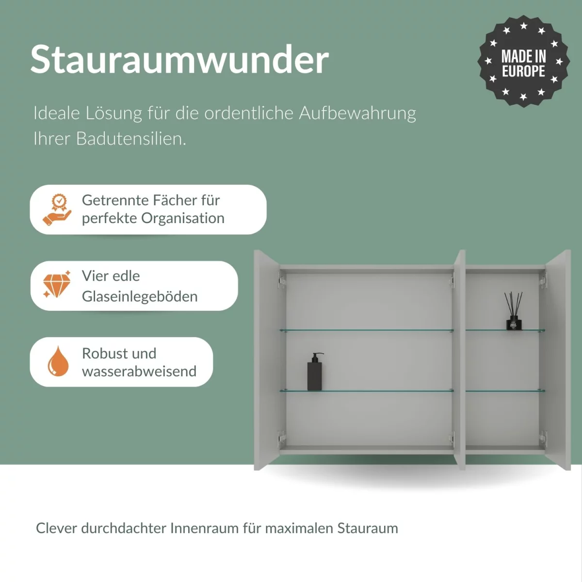 Der Spiegelschrank ist ausgestattet mit vier Glaseinlegeböden, deren Höhe frei wählbar ist, sowie einer Trennwand. Dies ermöglicht eine klare Struktur und unterstützt Sie bei Ihren täglichen Routinen. (ACHTUNG: ohne Steckdosenbox!)
