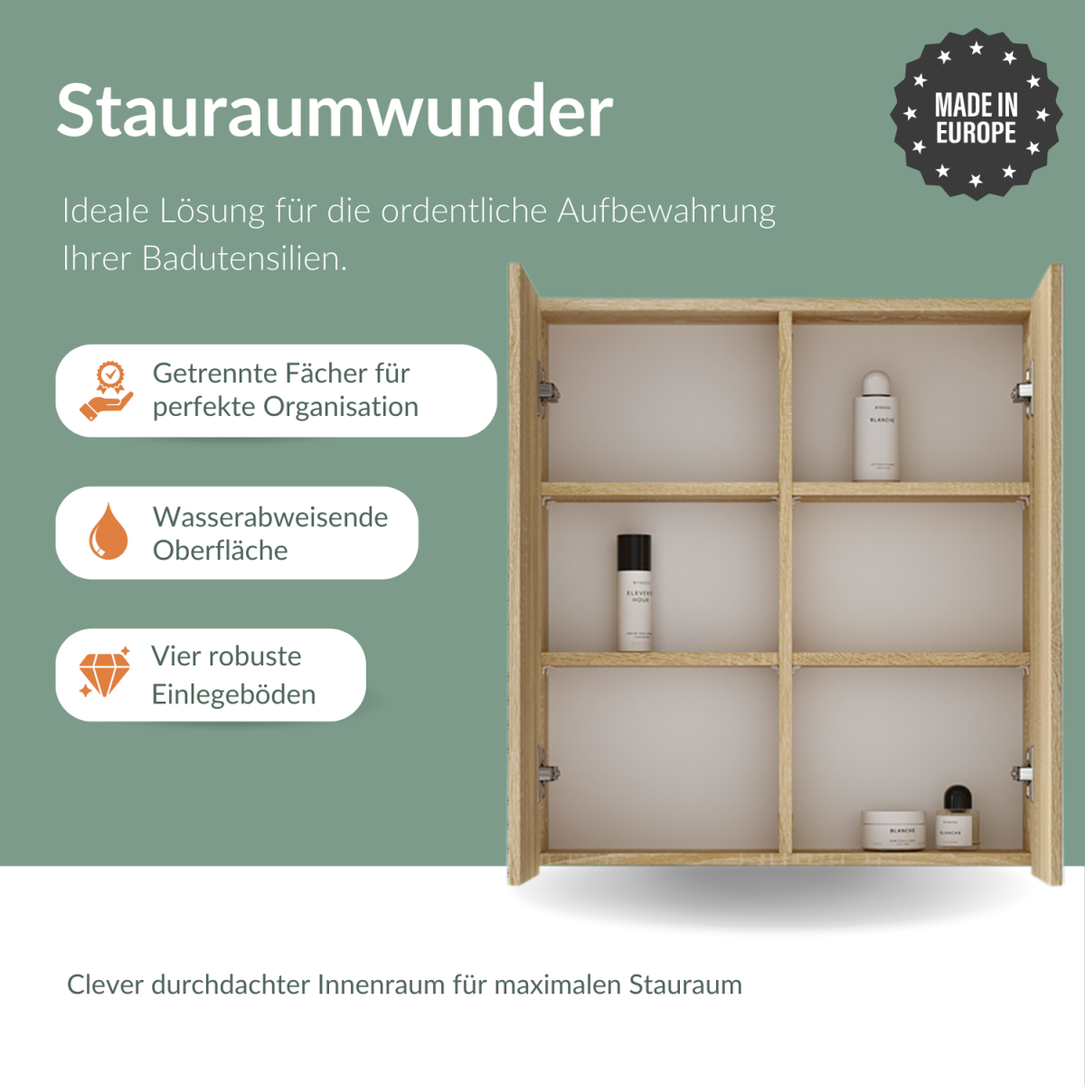 Hergestellt aus hochwertigen Materialien und mit einer robusten Konstruktion versehen, garantiert der Spiegelschrank Merkur eine lange Lebensdauer. Seine sorgfältige Verarbeitung macht ihn zu einem zuverlässigen Begleiter über viele Jahre hinweg.