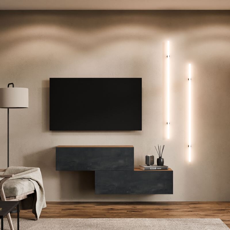 - Einsatzbereiche: Ideal als Wohnzimmer TV-Board oder für Mediennischen; harmoniert mit Holz- und Schwarz-Akzenten sowie Wohnwand-Kombinationen.