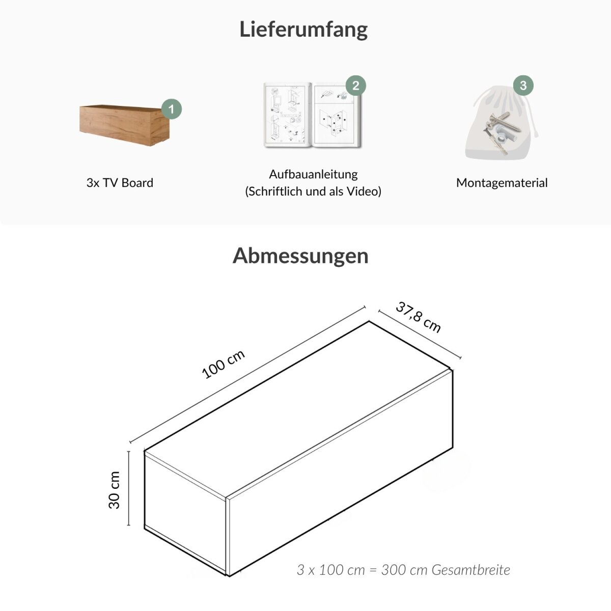 | Lieferungsumfang: | 3x TV-Board, 1x Montageanleitung, 1x Montagematerial |