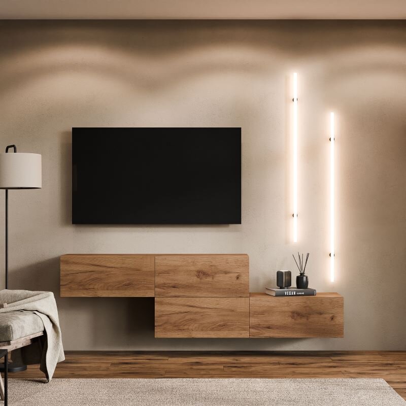 Zwei Boards je 140 × 32,5 × 37,8 cm bilden ein flaches TV Board fürs Wohnzimmer, wahlweise hängend mit schwebender Optik oder stehend auf Füßen. Ideal für TV, Konsole und Receiver; Leitungen lassen sich dezent führen, sodass Ihre Medienzone aufgeräumt wirkt.