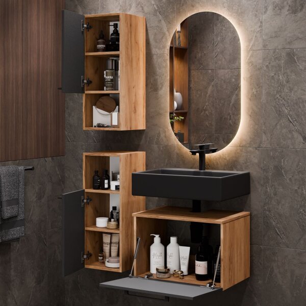 Gestalten Sie Ihr Badezimmer nach Ihren Wünschen mit unseren flexiblen Optionen. Die Hauptkomponente besteht aus unserem Waschtischunterschrank, welches Sie erweitern können mit unserem Spiegel, einem Seitenschrank, ein oder zwei Midischränken und unseren Keramikwaschbecken in schwarz oder weiß. Ihre Wunschkombination wartet auf Sie!