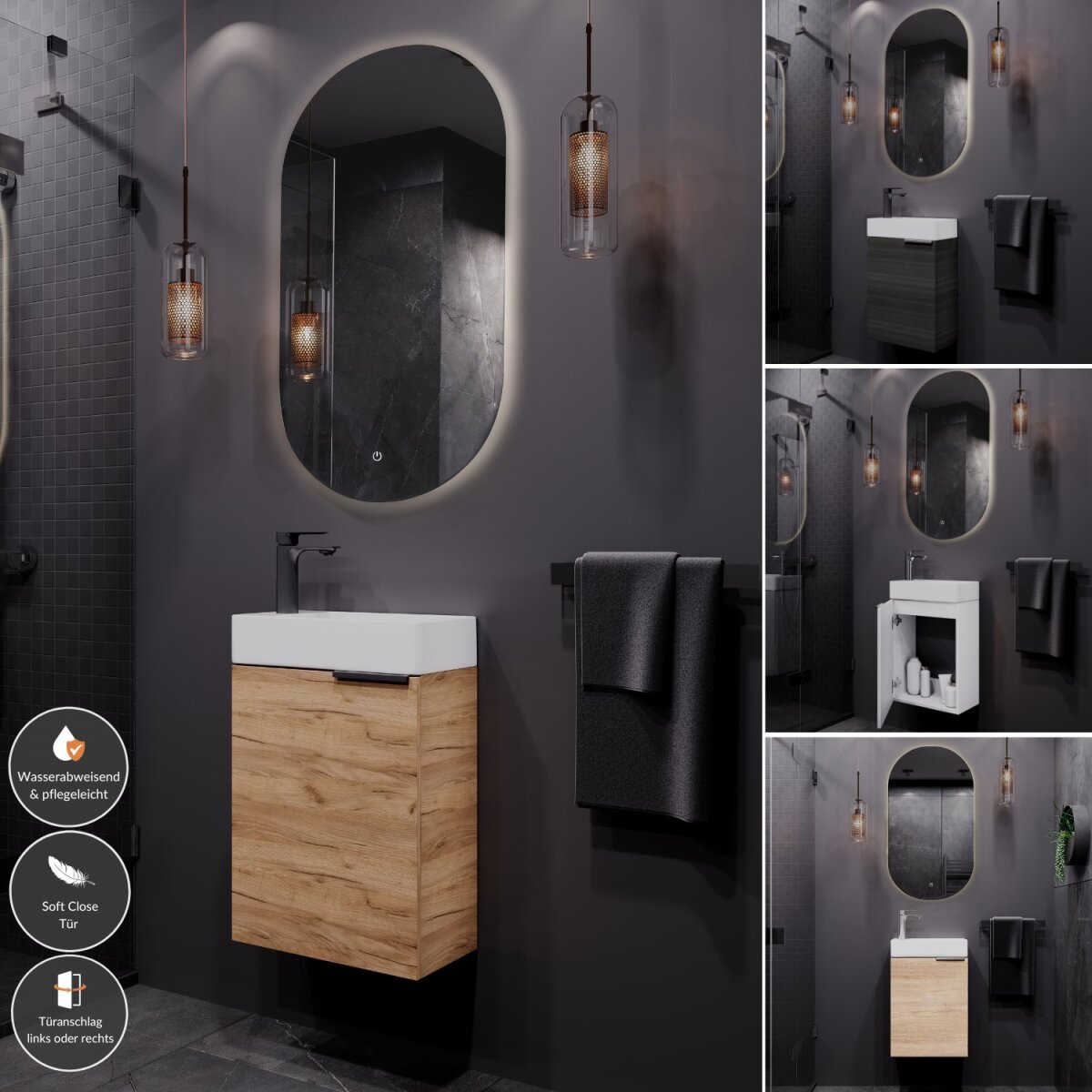 Modernes Design trifft auf clevere Raumnutzung: Dieses Badmöbel-Set mit 40 cm Breite ist die perfekte Wahl für kleine Bäder und Gäste-WCs. Es kombiniert einen platzsparenden Waschtischunterschrank mit hochwertigem Keramikbecken und einem LED-beleuchteten Spiegelschrank – für einen stilvollen und gut organisierten Waschplatz, auch auf kleinstem Raum.