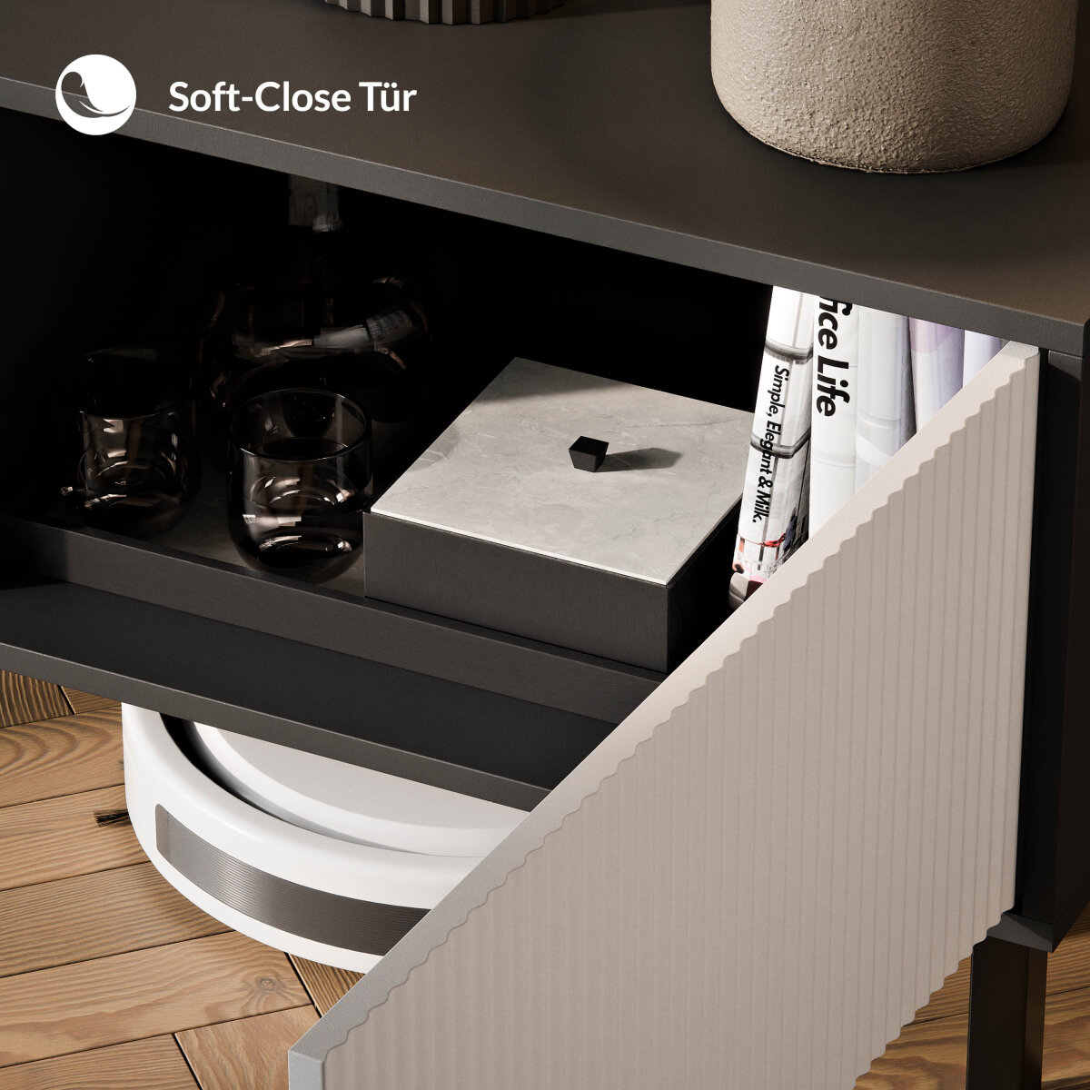 Das LIORA TV-Board bietet genügend Raum für einen modernen Saugroboter, der ungehindert seine Runden drehen kann und Ihr Wohnzimmer ohne Aufwand sauber hält. Gleichzeitig sorgt die mit einem Soft-Closer ausgestattete Tür für ein besonders sanftes und leises Schließen – ein Detail, das den hochwertigen Komfort des Möbelstücks spürbar unterstreicht.