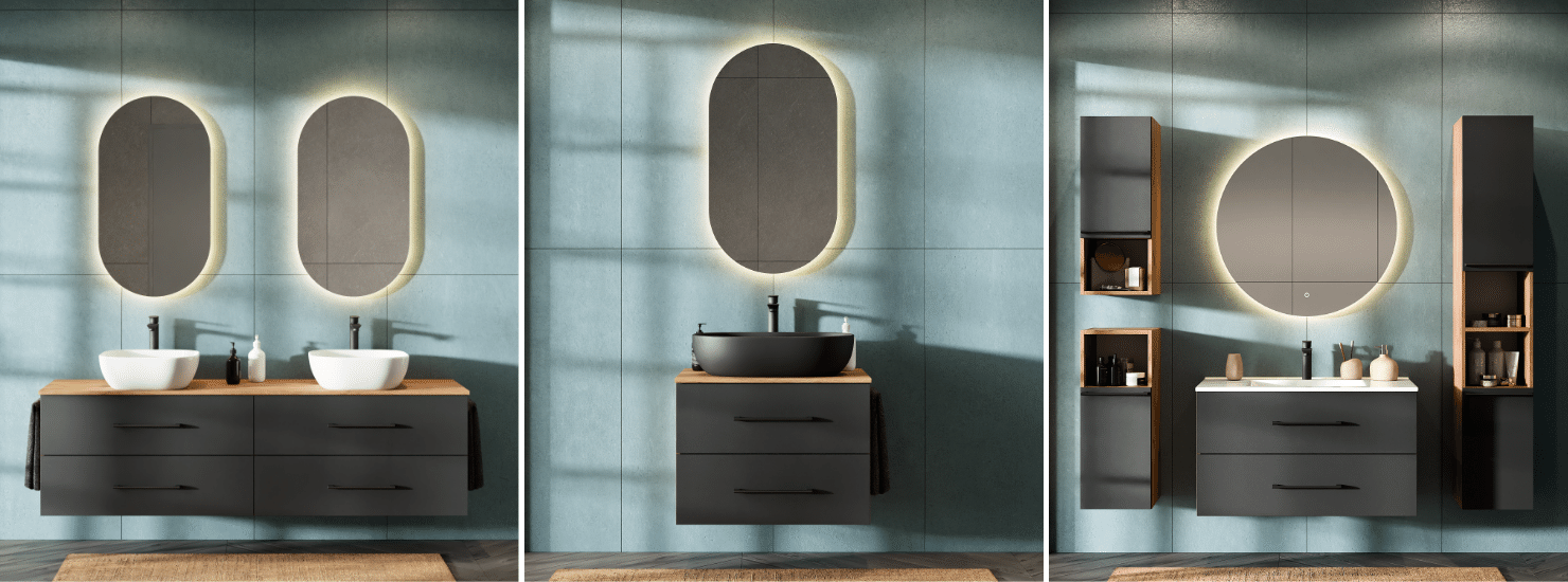 Gestalten Sie Ihr Möbelset individuell nach Ihren Wünschen. Kombinieren Sie Schränke, Spiegel, Waschbecken und mehr zu perfekt abgestimmten Lösungen.